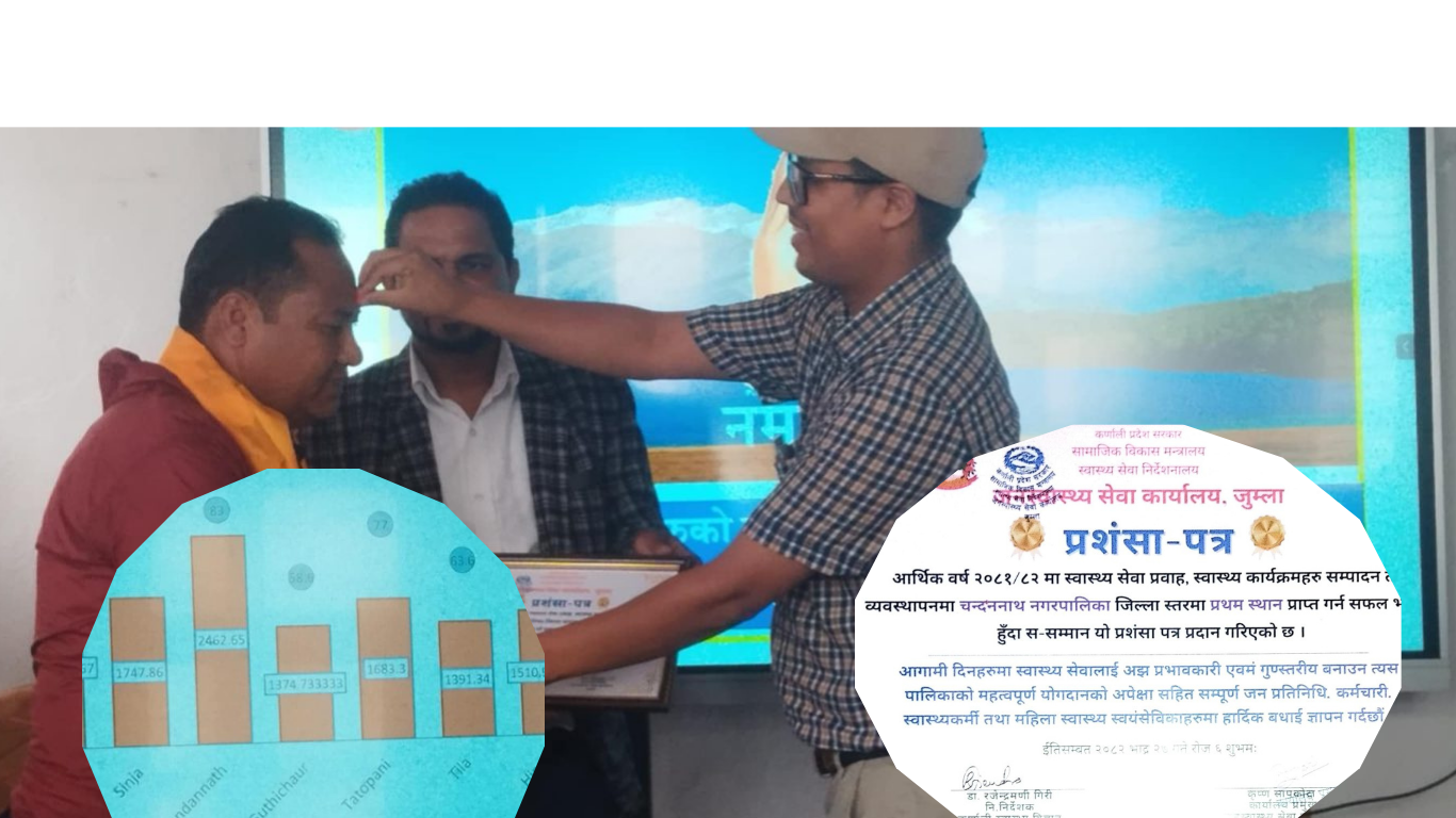 जनस्वास्थ्य सेवा कार्यालय जुम्लाका अनुसार, आर्थिक वर्ष ०८१/८२ मा स्वास्थ्य सेवा प्रवाह, कार्यसम्पादन र व्यवस्थापनका सूचकमा गरिएको मूल्यांकनमा चन्दननाथ नगरपालिकाले ८३ अंक प्राप्त गर्दै जिल्लामै पहिलो स्थान हासिल गरेको हो। उत्कृष्ट कार्यसम्पादनका लागि जनस्वास्थ्य सेवा कार्यालयका प्रमुख कृष्ण सापकोटाले चन्दननाथ नगरपालिका स्वास्थ्य शाखा प्रमुख क्षेत्र महतलाई प्रशंसा पत्र प्रदान गरेका छन्।