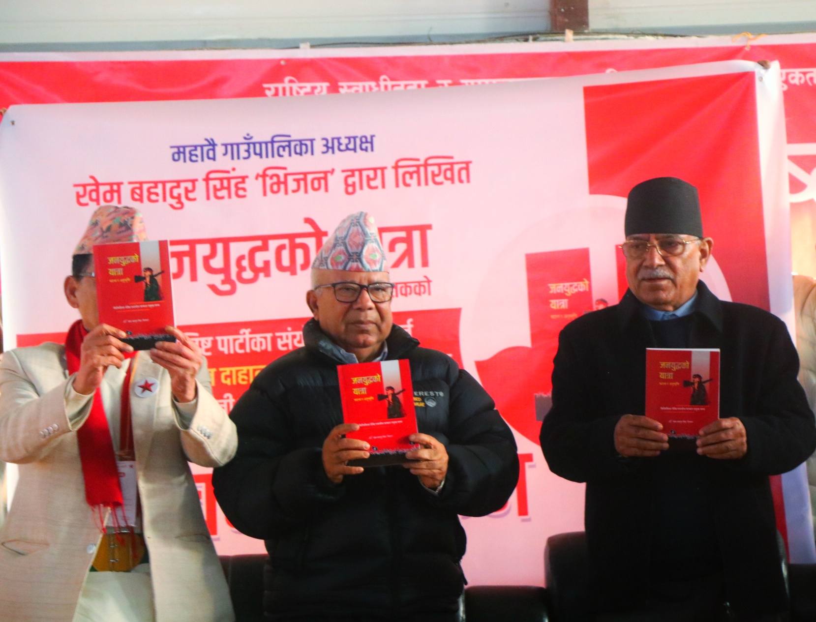 वीरेन्द्रनगर, सुर्खेतमा मंसिर २८ गते २०८२ आयोजित कार्यक्रममा नेपाली कम्युनिष्ट पार्टीका संयोजक तथा पूर्वप्रधानमन्त्री पुष्पकमल दाहाल ‘प्रचण्ड’ र सह–संयोजक तथा पूर्वप्रधानमन्त्री माधवकुमार नेपालले संयुक्त रूपमा पुस्तक विमोचन गर्नुभएको हो।