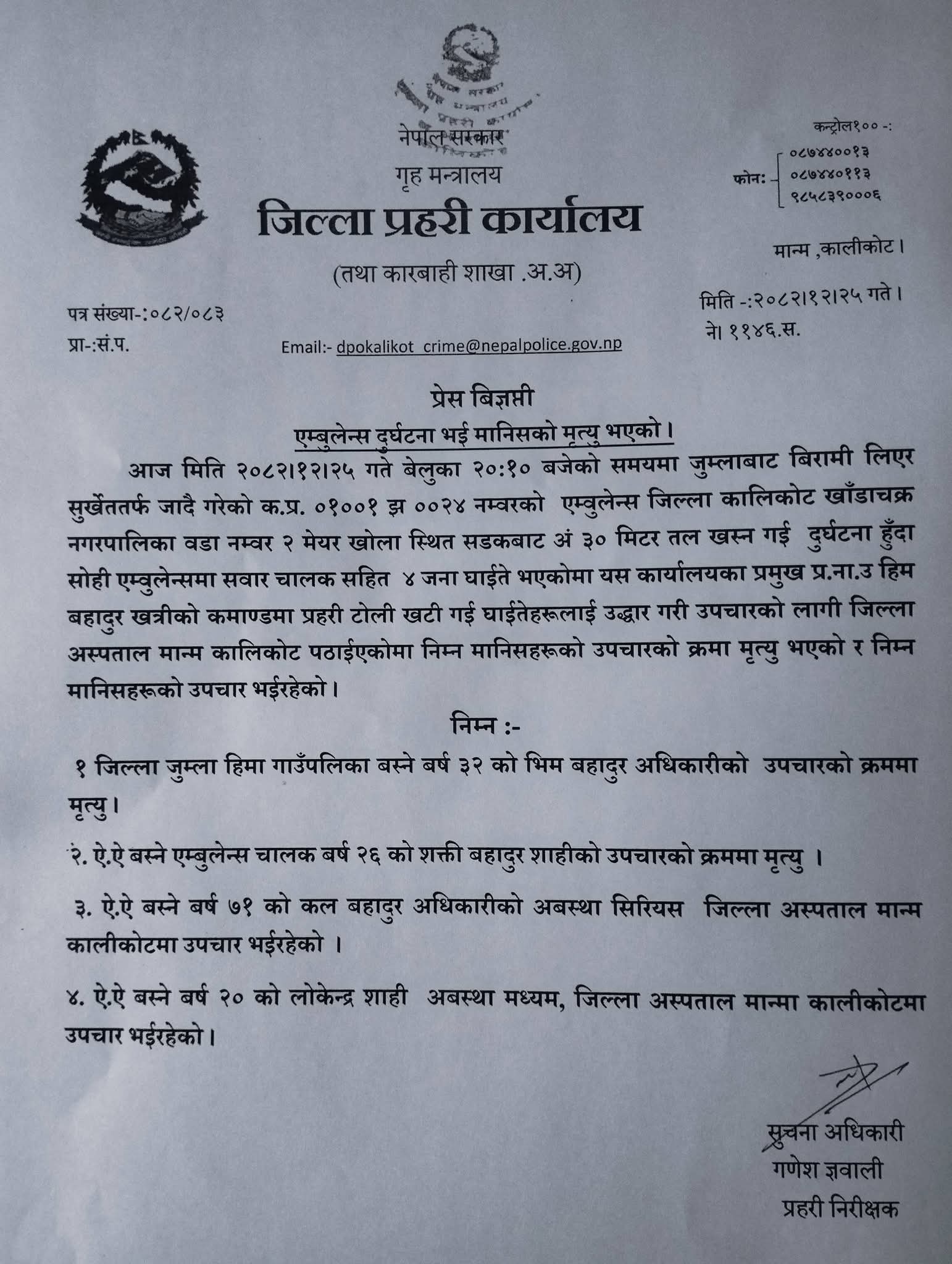 दुर्घटनामा परी जुम्ला जिल्लाको हिमा गाउँपालिका निवासी ३२ वर्षीय भीम बहादुर अधिकारी र एम्बुलेन्स चालक २६ वर्षीय शक्ति बहादुर शाहीको उपचारका क्रममा मृत्यु भएको प्रहरीले जनाएको छ।
