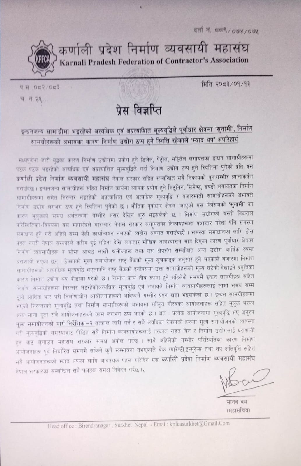 सुर्खेत । कर्णाली प्रदेश निर्माण व्यवसायी महासंघ ले इन्धन तथा निर्माण सामग्रीमा भएको अत्यधिक मूल्यवृद्धि र अभावका कारण निर्माण क्षेत्र गम्भीर संकटमा परेको जनाएको छ। महासंघका महासचिव मानव बमले जारी गरेको प्रेस विज्ञप्तिमा पछिल्लो समय डिजेल, पेट्रोल, मट्टीतेल लगायतका इन्धन तथा सिमेन्ट, डण्डी जस्ता निर्माण सामग्रीको मूल्य निरन्तर बढ्दै जाँदा निर्माण उद्योग नै ठप्प हुने अवस्थामा पुगेको उल्लेख गरिएको छ।